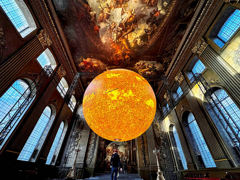 A large sun installation, “Helios” by Luke Jerram, is displayed in the Painted Hall at the Old Royal Naval College in London on Monday.