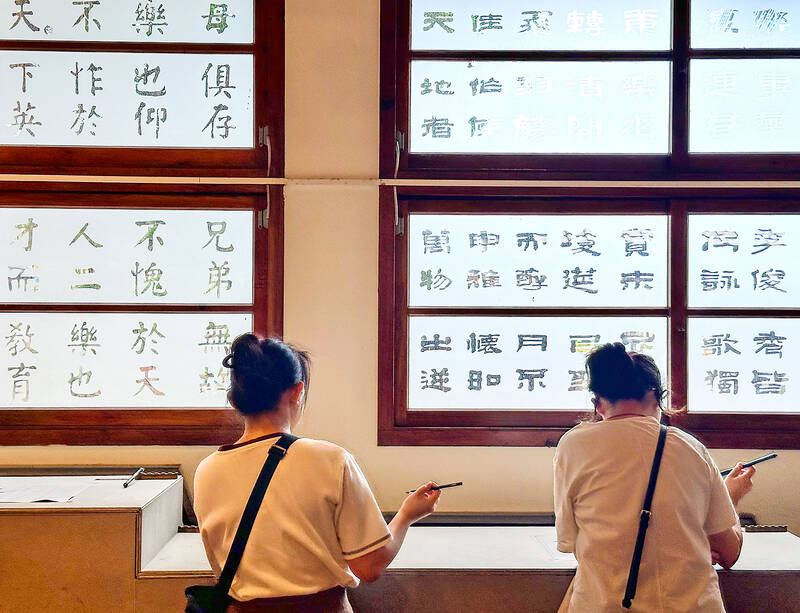 People practice calligraphy at the Chu Jiu Ying Memorial Hall in Tainan’s Anping District yesterday. The venue is the former residence of renowned calligrapher Chu (1898-1996) and today an exhibition space for his works, with the “Yan-style Heart Sutra,” regarded as his most attractive piece, taking up an entire wall. Visitors to the exhibition can practice calligraphy during the Lunar New Year holiday.