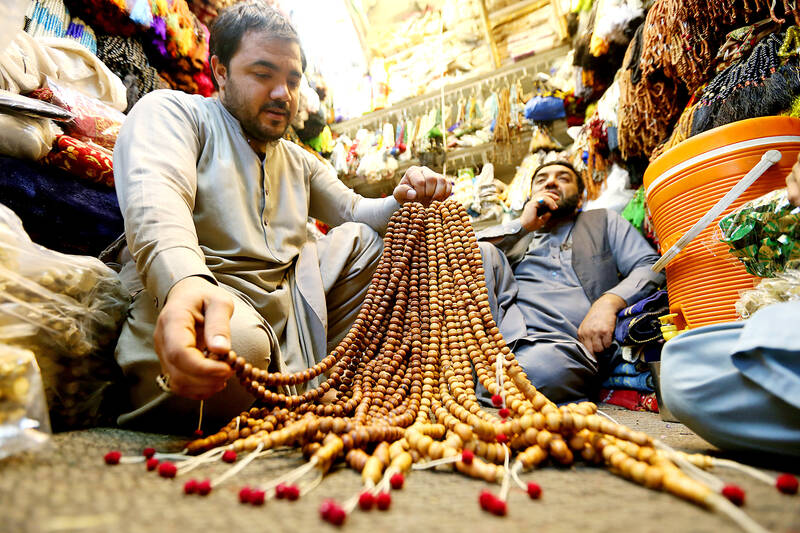 A vendor sells prayer beads ahead of the holy month of Ramadan in Peshawar, Pakistan, yesteday. The beginning of Ramadan is expected to fall on Saturday, depending on the sighting of the crescent moon. Muslims around the world celebrate the month of Ramadan by praying at night and abstaining from eating, drinking and sexual acts during the period between sunrise and sunset.
