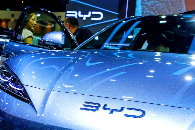 Shares in Chinese electric vehicle (EV) giant BYD Co (比亞迪) surged to a record high yesterday after it unveiled new battery technology that it says can charge a vehicle in the same time it takes to fill up a car with gasoline.