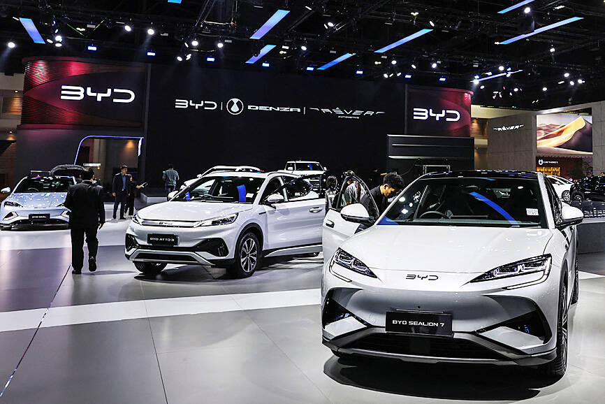 BYD Co’s (比亞迪) sales last year surpassed the US$100 billion mark, leapfrogging Elon Musk’s Tesla Inc on revenue, as the Chinese auto giant wows consumers with a range of electric and hybrid cars packed with high-tech features.