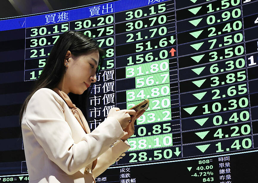 Taiwan Semiconductor Manufacturing Co (TSMC, 台積電), the most heavily weighted stock on the TAIEX, fell 3.77 percent to close at NT$816, and Hon Hai Precision Industry Co (鴻海精密), second to TSMC in terms of market value, fell by the daily maximum for a second day to close at NT$125.