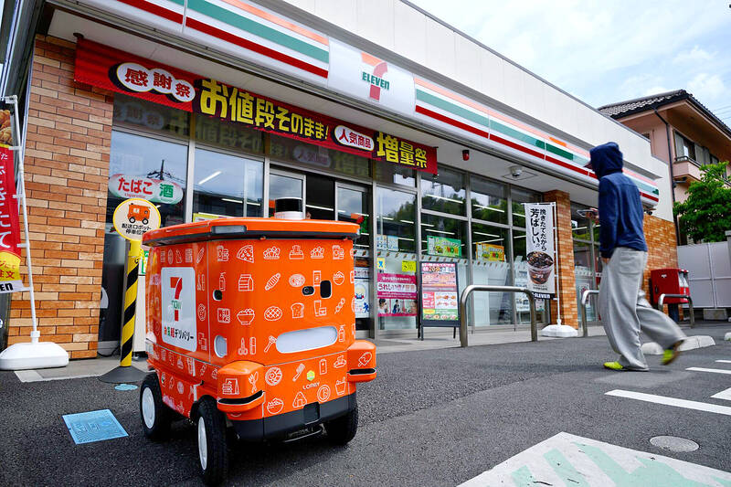 An autonomous delivery robot is pictured outside a 7-Eleven convenience store during a demonstration in Hachioji, Japan, on Thursday last week. Seven-Eleven Japan Co started a pilot delivery service with the robots, coproduced by Suzuki Motors Corp and Lomby Inc.