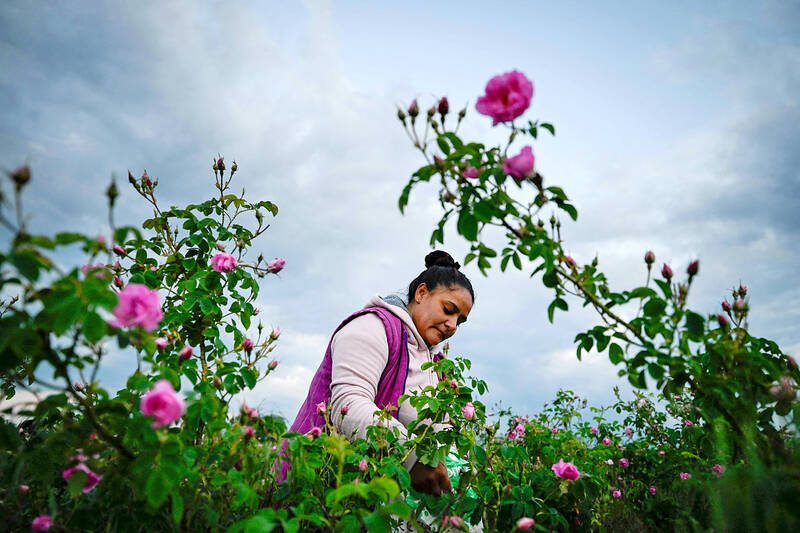 A woman collects rose petals early in the morning in the Rose Valley, near the village of Cherganovo, Bulgaria, yesterday. Bulgaria is widely recognized as the world’s leading producer and exporter of rose oil. The so-called “liquid gold” had an average price of 9,168 euros (US$10,425) per kilogram in 2023, according to the Bulgarian Ministry of Agriculture, Food and Forestry. It takes about 3 tonnes of rose flowers, or about 1.6 million rose petals, to produce a kilogram of rose oil.