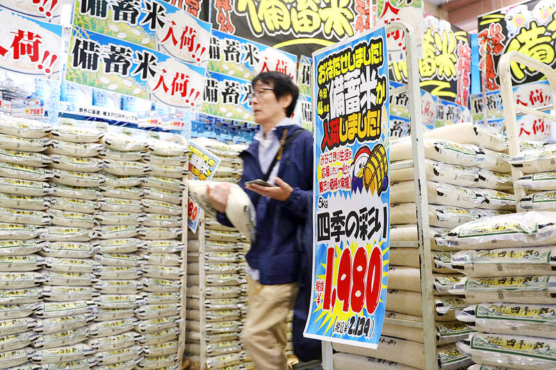 A customer walks past sacks of rice at a Don Quijote store in Tokyo on Sunday. The rice was released from government reserves directly to large retailers under a discretionary contract in an attempt to bring down prices for consumers after a recent spike.