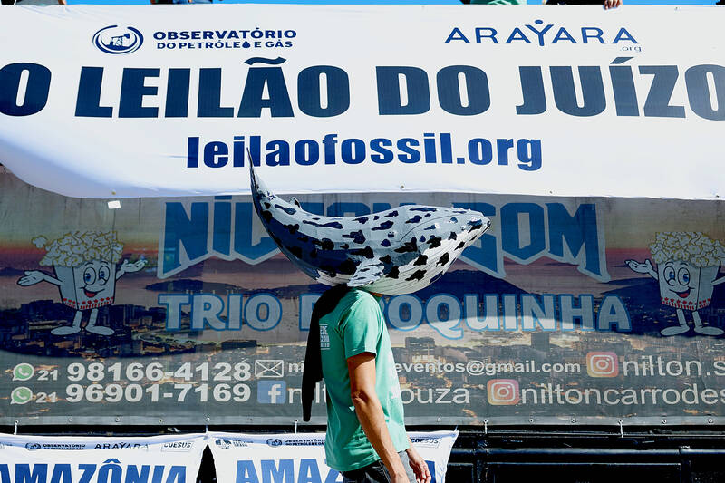 A man wearing headgear resembling a whale participates in a protest in Rio de Janeiro on Tuesday. About 100 demonstrators, including indigenous people, environmentalists and union members, protested against an auction promoted by the Brazilian government to offer concessions for the exploration and exploitation of areas in a vulnerable marine region near the mouth of the Amazon.