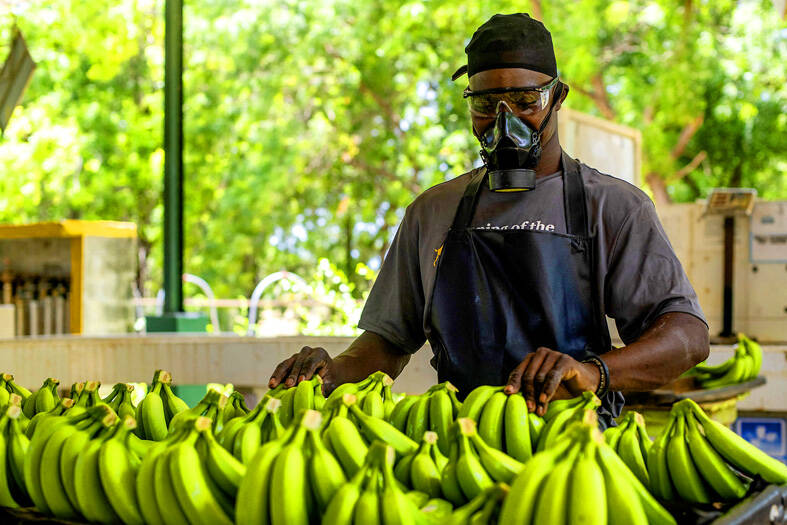 At the plantation where Cheranfant works, bunches of bananas are harvested with machetes before being placed on a steel hook and moved along a cable to another area where they are sorted and packed for sale.