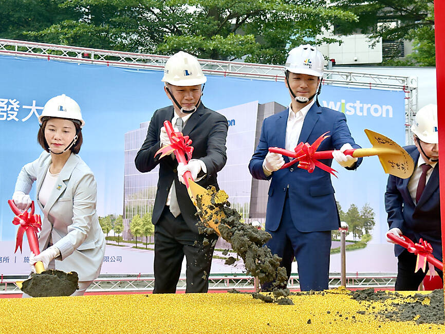 Wistron yesterday held a groundbreaking ceremony for the construction of a new research-and-development center in Taipei’s Neihu District (內湖). The center is about 1km from the company’s new Neihu headquarters, with construction slated for completion in 2028 at a planned investment of up to NT$2.7 billion (US$92.2 million).