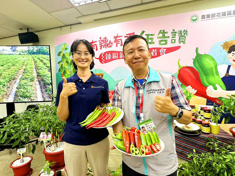 Asian Vegetable Research and Development Center researcher Lin Shih-wen, left, and Hualien District Agricultural Research and Extension Station researcher Wang Chi-cheng, present new chili varieties at a news conference in Taipei yesterday. The two new varieties — thinner, medium spicy “Youhsin” and fatter, slightly spicy “Youhsiang” — were introduced to improve the problem of chilies being too spicy in summer and make them easier to eat when processed or stir-fried.
