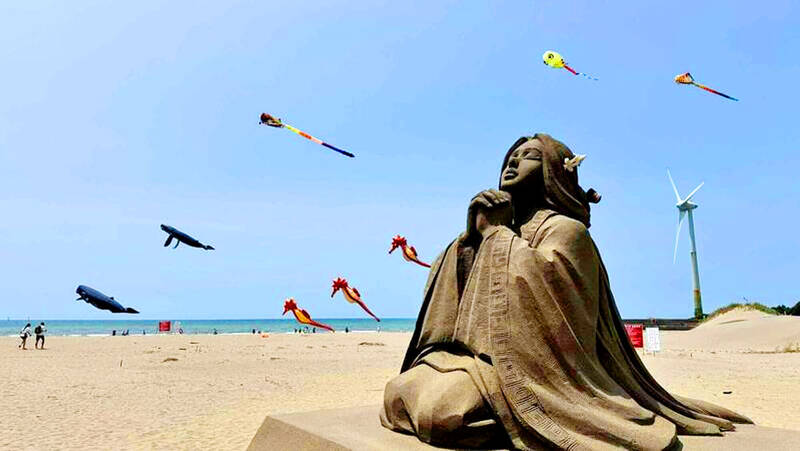 Kites fly behind a sand sculpture at Tongxiao Beach in Miaoli County’s Tongxiao Township yesterday. Typhoon Podul did not do much damage to the 22 sand sculptures at the Tongxiao Sand Sculpture Art Festival, which runs through Sept. 14. Weekend food markets, cultural performances and light shows are also part of the festival, the county government said.