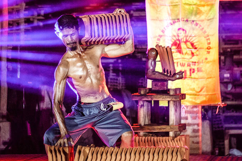 A young Indonesian man turns his back to a crowd, flexing his oiled-up muscles before picking up a stack of roof tiles, holding as many as he can in a pose reminiscent of Mr. Olympia.