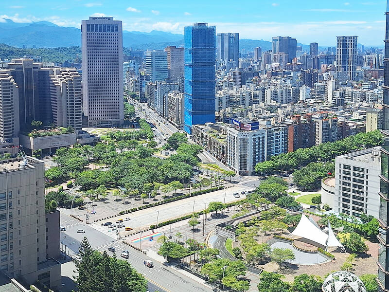 Buildings are pictured in Taipei’s Xinyi District yesterday. Total housing transactions in Taiwan in the first seven months of this year plunged 26.8 percent year-on-year to 154,077 units, the lowest level for the same period since 2018, real-estate brokerages said yesterday, citing Ministry of the Interior data. The cooling of the housing market reflects the effects of the central bank’s selective credit controls and lenders becoming conservative in extending new mortgages, brokerages said.