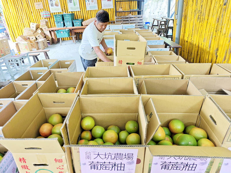 Dakeng Leisure Farm head Tsai Cheng-wen packs grapefruit in Tainan’s Sinhua District yesterday. The freshly harvested fruit, along with others such as papayas and oranges, are to be shipped to flood-hit areas of Hualien County as part of donations for disaster relief, Tsai said.