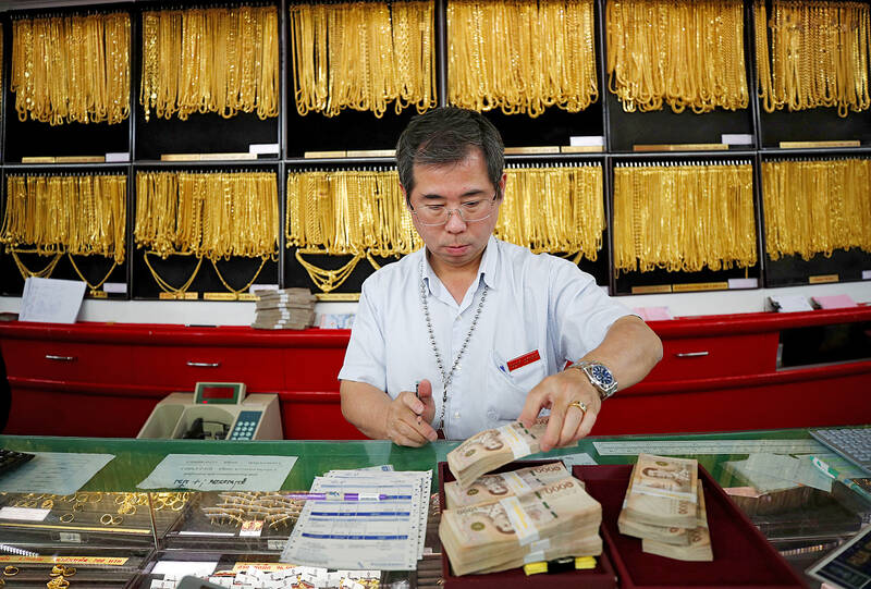 A goldsmith counts banknotes at the Hua Seng Heng gold shop in Bangkok yesterday. Thailand’s gold prices continued to surge, following global trends as the spot price of gold surpassed US$4,000 per ounce for the first time, with investors turning to the precious metal amid global political and economic uncertainty.