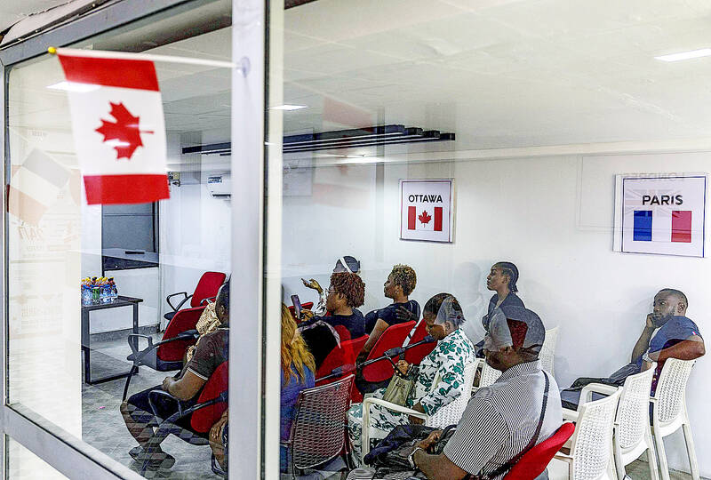 A dozen red-and-white banners with maple-leaf borders flag the premises of Bodia’s Objectif Canada in the economic capital, Douala, with the North American nation a favored destination.