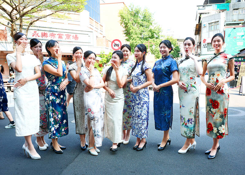 Women dressed in “qipao” dresses gesture during the “1920s Dress-Up Event” of the Tua-Tiu-Tiann International Festival of Arts on Dihua Street in Taipei yesterday. The month-long festival features performances, workshops and events themed around the historical Dadaocheng area in the 1920s.