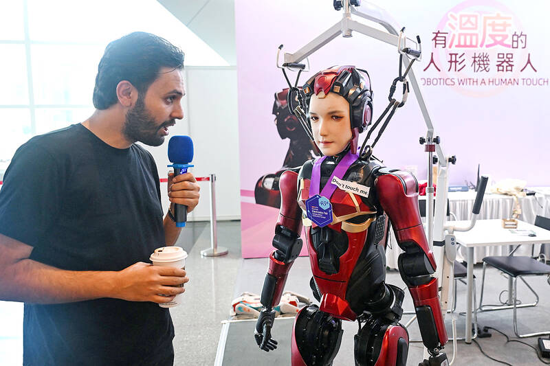 A man talks to a humanoid robot during the Hong Kong Electronics Fair yesterday.