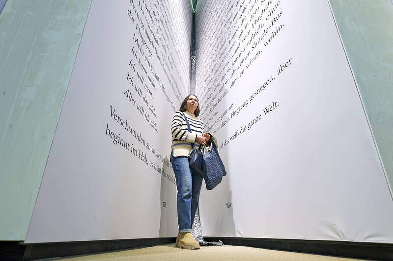 A visitor poses for a photo between the pages of a giant book at the Frankfurt International Book Fair in Germany yesterday. The book fair runs until tomorrow. Its “guest of honor” this year is the Philippines, with the motto “The imagination peoples the air.”