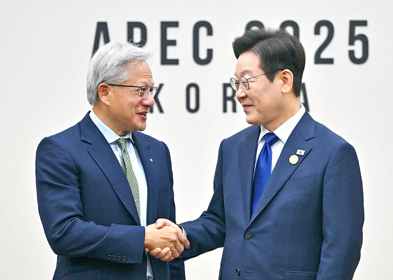 Nvidia CEO Jensen Huang (黃仁勳) was in South Korea attending the APEC CEO Summit yesterday. He used the trip to continue a globe-trotting push to spread the use of AI computing — and fuel demand for his products. The deals in South Korea help further entrench Nvidia’s equipment in a country with a vibrant technology industry.