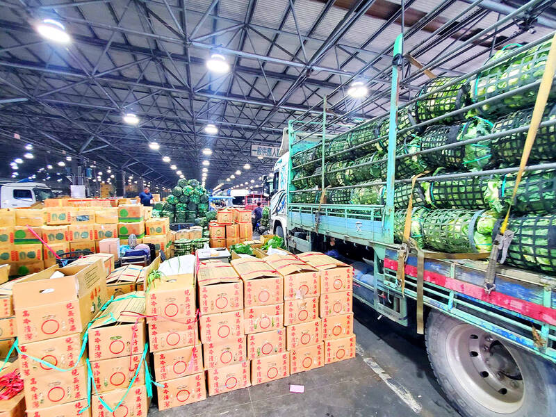 A truck loaded with vegetables and boxes of produce is pictured at a wholesale market in Yunlin County’s Siluo Township yesterday. A total of 8.4 million tonnes of vegetables arrived at the market yesterday at an average price of NT$34 per kilogram. The price is expected to show a slight increase after Tropical Storm Fung-wong passes by Taiwan, the market said.