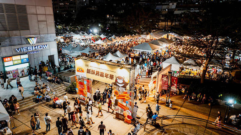 People visit the Kaohsiung Popcorn Chicken Festival at the plaza in front of the FE21’ Mega Far Eastern Department Store in the city’s Lingya District on Sunday. The two-day event featured 65 popcorn chicken stands from across Taiwan, with each offering its own unique flavor, the Kaohsiung Tourism Bureau said yesterday. The fifth annual event drew more than 120,000 visitors over the weekend, the bureau said.