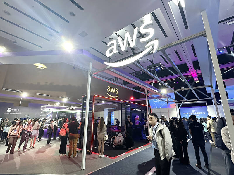 People visit a technology event organized by Amazon Web Services (AWS) at the Kaohsiung Exhibition Center yesterday. The event showcased AWS’ cloud services and smart technologies aiming to accelerate industrial upgrade and digital transformation across various industries.