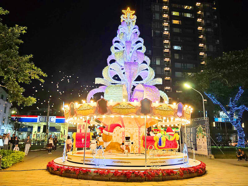 The Pingtung County Government lights up a Christmas merry-go-round at a park in Pingtung City yesterday ahead of the opening of the Pingtung Christmas Festival on Friday. The event, which is to run until Jan. 4, features 14 light shows and themed displays across the city.