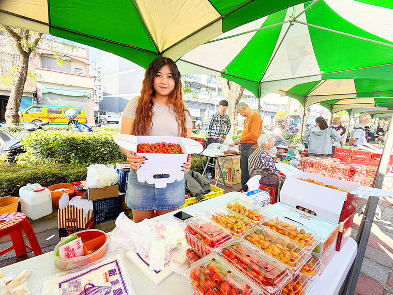 A woman holds a box of tomatoes under a tent outside the Lujhu Sports Park in Kaohsiung yesterday. The Lujhu District Office held a tomato festival over the weekend to promote the seasonal fruit, as the harvest this winter was of excellent quality due to favorable weather and low rainfall.