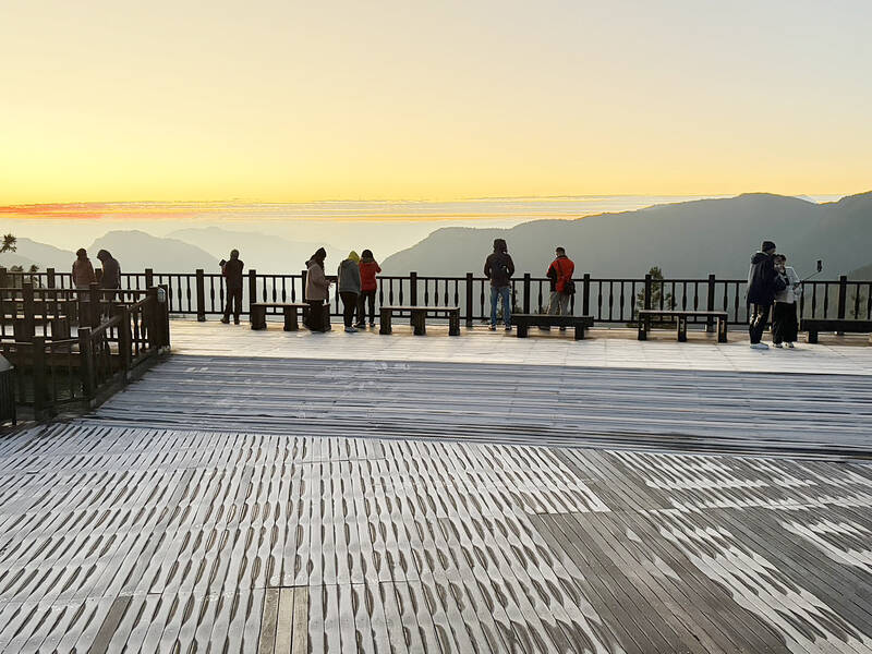 People watch a sunrise at the Taiping Villa plaza in Yilan County’s Taipingshan National Forest Recreation Area yesterday. The plaza, which is 1,950m above sea level, was covered in a thin layer of frost as temperatures plunged to minus-4°C at 6am yesterday.