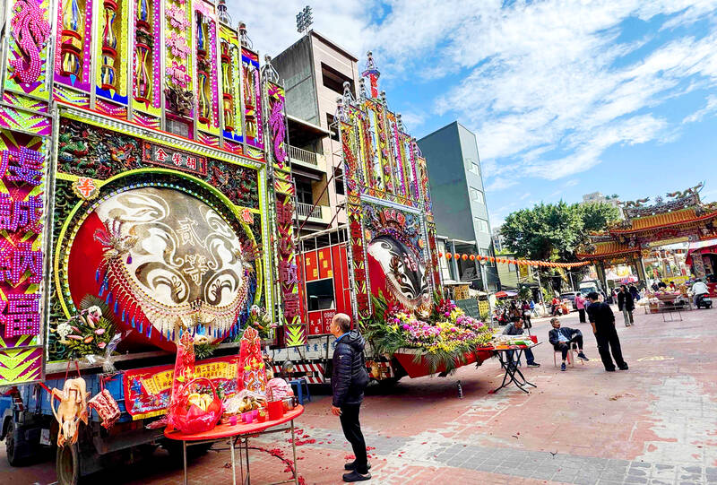 A man looks at a “divine pig” displayed outside the Renhai Temple in Taoyuan’s Jhongli District yesterday. Eighteen divine pigs — nine of which weigh more than 600kg, with the heaviest one weighing 906.8kg — as well as seven divine goats and 28 chickens were displayed as offerings at the temple, which is celebrating its 200th anniversary.