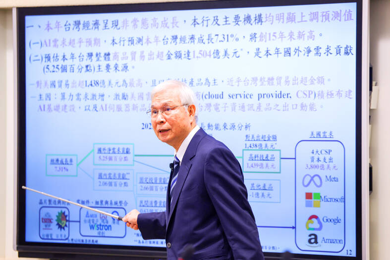 “Taiwan’s GDP growth has been widely underestimated by both domestic and international institutions, as global demand for AI hardware has outpaced expectations and is set to continue driving expansion next year,” central bank Governor Yang Chin-long (楊金龍) said following the bank’s policy meeting.
