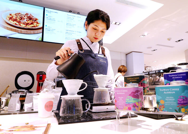 A barista brews coffee at Taiwan Taoyuan International Airport’s Terminal 1 yesterday. Operators of four well-known Alishan coffee farms yesterday launched their outlets at the airport to showcase Taiwan’s high-mountain coffee to foreign visitors.