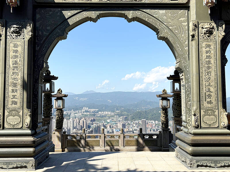The archway and lampposts of Shengde Temple in New Taipei City’s Sijhih District are pictured with the city’s skyline and verdant mountains in the distance yesterday. The temple has become one of the top popular, Instagrammable photo spots in the greater Taipei area in recent years, with its architectural style giving the scene a dreamlike quality.