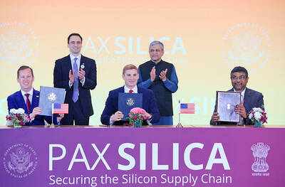 STRATEGIC ALLIANCE: The initiative is aimed at protecting semiconductor supply chain resilience to reduce dependence on China-dominated manufacturing hubs India yesterday joined a US-led initiative to strengthen technology cooperation among strategic allies in a move that underscores the nations’ warming ties after a brief strain over New Delhi’s unabated purchase of discounted Russian oil. The decision aligns India closely with Washington’s efforts to build secure supply chains for semiconductors, advanced manufacturing and critical technologies at a time when geopolitical competition with China is intensifying. It also signals a reset in relations following friction over energy trade and tariffs. Nations that have joined the Pax Silica framework include Japan, South Korea, the UK and Israel. “Pax Silica will be a group of nations