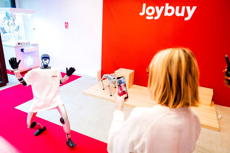 A woman films a Unitree G1 humanoid robot at the JoyBuy pop-up showroom, operated by JD.com Inc, at the company’s headquarters in Paris yesterday. JD.com is launching in the UK and other European countries, part of an overseas expansion as China’s answer to Amazon.com Inc faces intense competition in its home market.