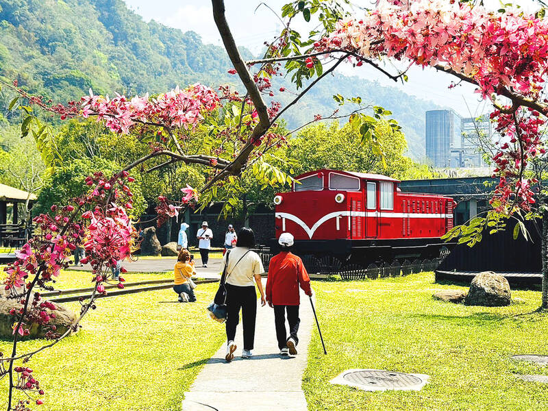 People walk toward a locomotive at the Alishan National Scenic Area’s Chukou Visitor Center in Chiayi County yesterday. Once a popular spot for viewing blossoming pink shower trees, only three trees at the center have bloomed so far this year, as most of them were damaged by Typhoon Danas last year.