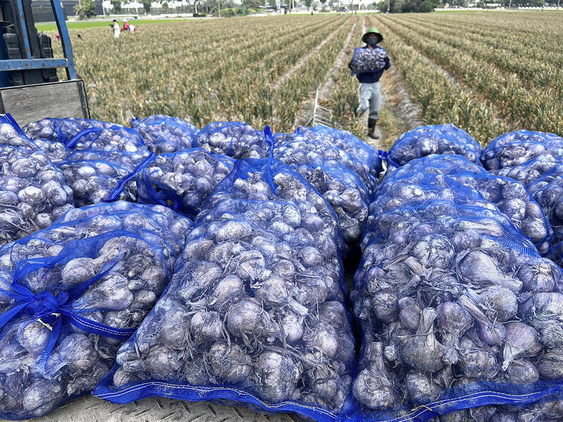 A farmer with a bag of garlic bulbs walks on his field in Yunlin County yesterday. Yunlin is the largest garlic-producing area in Taiwan. Due to a warm winter and little rain, the county’s garlic yield is poor and garlic bulbs are smaller than usual, pushing down wholesale prices, the Agriculture and Food Agency said.
