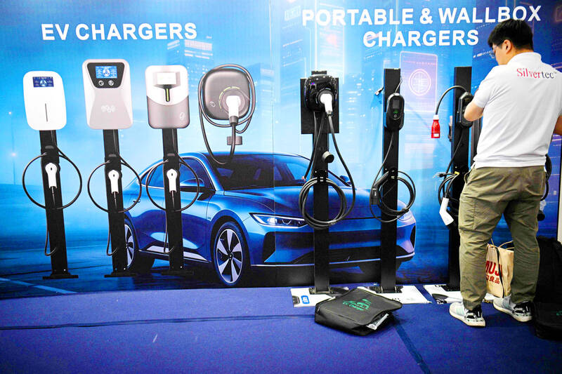 A worker arranges different types of China-made electric car chargers on display during the opening day of the International Auto Show in Manila yesterday.