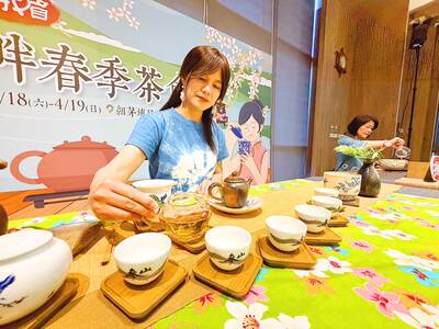 Women perform tea ceremonies at a news conference in Hsinchu County’s Emei Township yesterday. The Tri-Mountain National Scenic Area Administration is to hold a lakeside event on April 18 and 19 in Emei, featuring the making and tasting of locally produced oolong tea, known as Oriental Beauty tea, a
