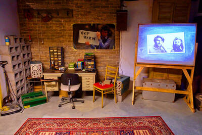 A picture of Apple founders Steve Wozniak, right, and Steve Jobs is displayed in decor of the garage where it all started, at the new Apple Museum, which traces 50 years of the brand’s innovations, in Utrecht, Netherlands, yesterday.