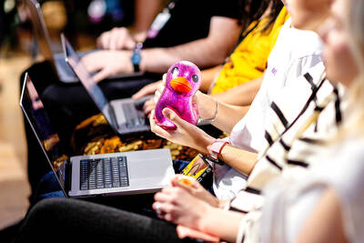 An employee holds a rubber duck during a Canva AI demonstration at the Canva Pty Ltd headquarters in Sydney, Australia, on April 2. Canva is pouring hundreds of millions of dollars into artificial intelligence (AI) to try to become the operating system for AI-native design.