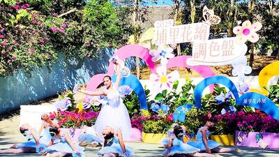 Dancers perform at a news conference in Nantou County’s Puli Township yesterday promoting the upcoming Puli Flower Exhibition and Nantou Floral Carnival, which are to start tomorrow and run until Dec. 7 at the Puli Flower Logistics Center and the plaza in front of Puli Hengji Temple respectively.