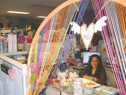 In her 18 years as a designer and illustrator at American Greetings Corp in Cleveland, her cubicle has undergone several renovations: For a few years it was a garden, complete with an arch of fake ivy, pink silk roses and sparkly little lights. Last month she went retro, festooning the arch with rainbow-color fringe and light-reflecting colored plastic disks.