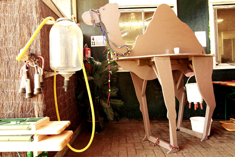 The dromedaries are milked one by one, morning and night, by a machine specially adapted to their teats. Each cow provides about 6 liters of milk per day, compared with about 30 liters from a cow.