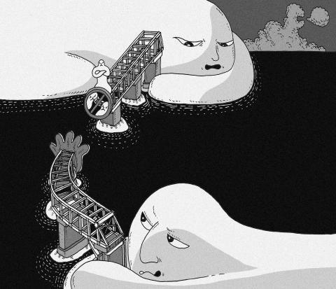 The gap between the bridge and the riverbank — left by Russia’s failure to build its own, much shorter share of the project — exposes the reality behind the pledges of an ever closer Russian-Chinese partnership made when Russian President Vladimir Putin met in Beijing last month with Chinese President Xi Jinping (習近平). It was their 15th meeting.