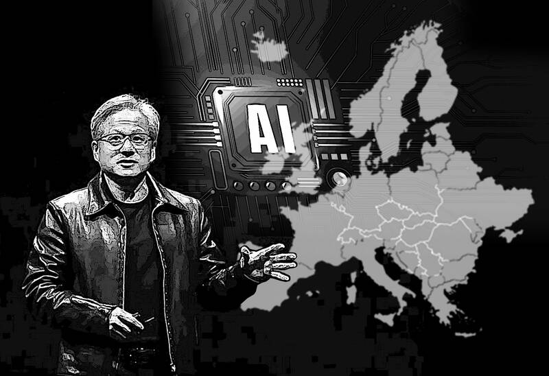 Nvidia Corp billionaire boss Jensen Huang (黃仁勳), clad in his signature leather jacket, has been crisscrossing European capitals and sharing the stage with the likes of British Prime Minister Keir Starmer and French President Emmanuel Macron as he pitches “sovereign” artificial intelligence (AI), a vision of new data centers offering essential compute power within national borders rather than via dominant tech firms from abroad. But if there were prizes for irony, it is a concept that might win a few.