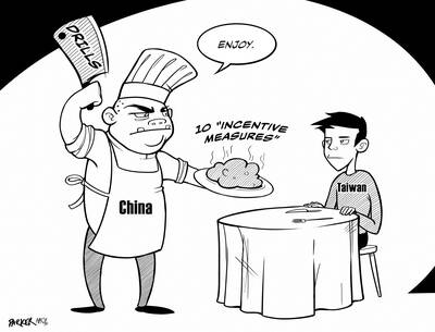 Following last week’s meeting between Chinese Nationalist Party (KMT) Chairwoman Cheng Li-wun (鄭麗文) and Chinese President Xi Jinping (習近平), the Chinese Communist Party (CCP) announced 10 incentive measures for Taiwan, including imports of agricultural, fishery and food products, but tied them to the