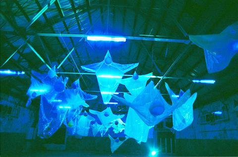 For a start, having limited experience of installation art -- mostly drawn from Yitong St's charming IT Park bar and studio, where you are forced to wander through the art to get to the beers -- I was finding it difficult at first to figure out where the art was. I was sitting on a tiny chair in a massive hanger-like building festooned with what looked to be 7-Eleven rain ponchos with inflated balloons for heads, back-lit with fluorescent strip- lights masked with blue cellophane. And it was only after a few minutes into the preamble by artist and show director, Hsieh Su-lien, that I realized that the rain ponchos, balloons and cellophane-masked strip lights were the art. The rain ponchos and balloons were the comet men, and the blue lights would, when evening came, Hsieh was telling us, cast a deep blue glow over everything that would suggest the overarching heavens, and also equally a womb-like atmosphere.