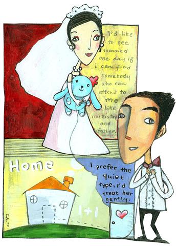 "I hope she can get married one day if she can find someone who is willing to take care of her," says Mr Chen, a salesman whose 20-year old daughter Chen Tzu-ying (陳姿穎) has epilepsy and as a result is slightly mentally disabled. "I don't mind if she marries someone with a similar physical disability, but then the marriage would demand a lot of assistance from us."