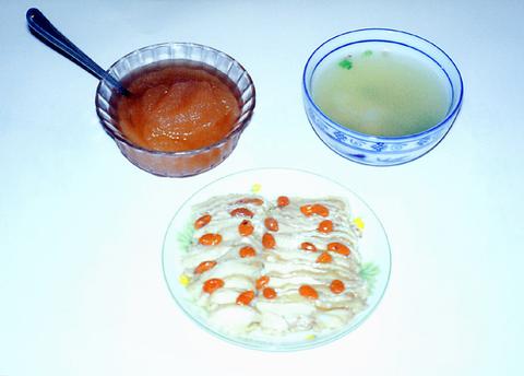 The menu incorporates a wide range of flavors, and currently includes Chinese medicinal dishes such as stewed chicken with ginseng (人蔘燉雞), a nutritious dish that nourishes the eyes and enhances your immunity. Another special dish is boneless chicken marinated in Shaoxing wine (無骨醉雞), which is served chilled. The cold flesh and slightly tangy tasted imparted by the alcohol make it a particular favorite with children, Chang said. Noodles and vegetarian dishes are also available.